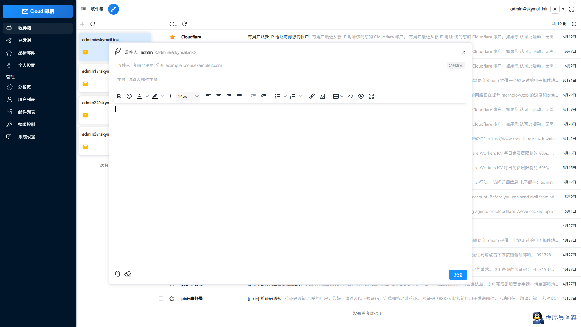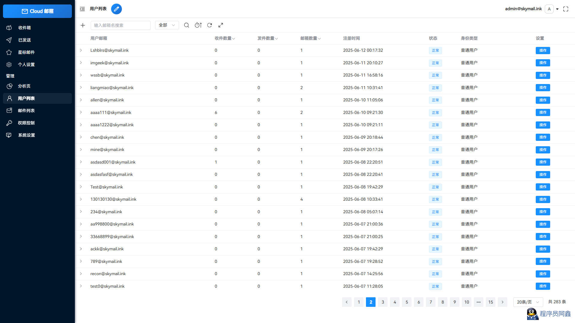 管理员功能:可以对用户,邮件进行管理,RABC权限控制对功能及使用资源限制