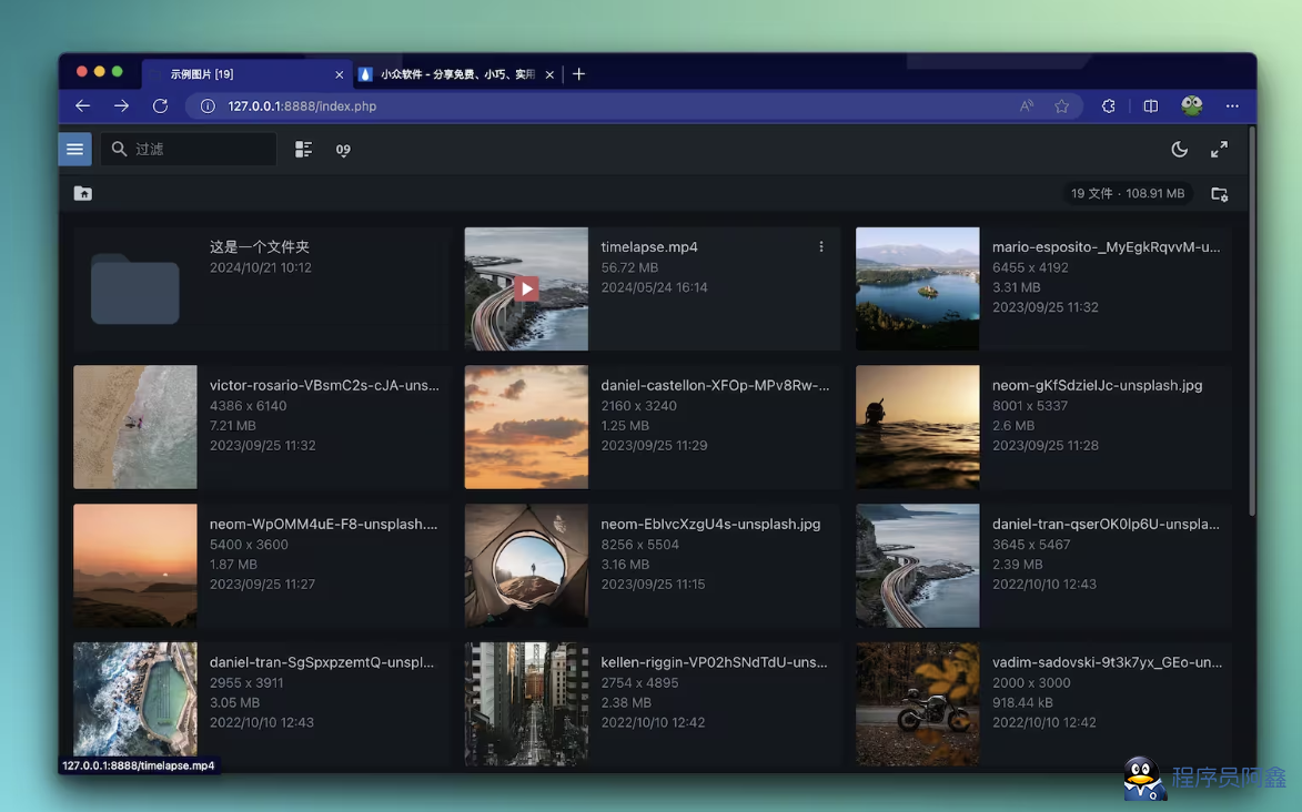 Files Gallery 是一个单文件的 PHP 程序,只需要把这个文件放到任意文件夹中,通过浏览器访问,该文件夹就变成了网页版本的文件库,可以预览图片、视频、音频,以及文本文件。