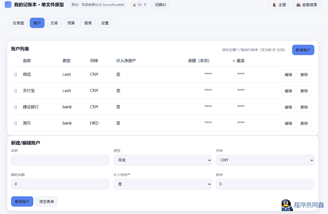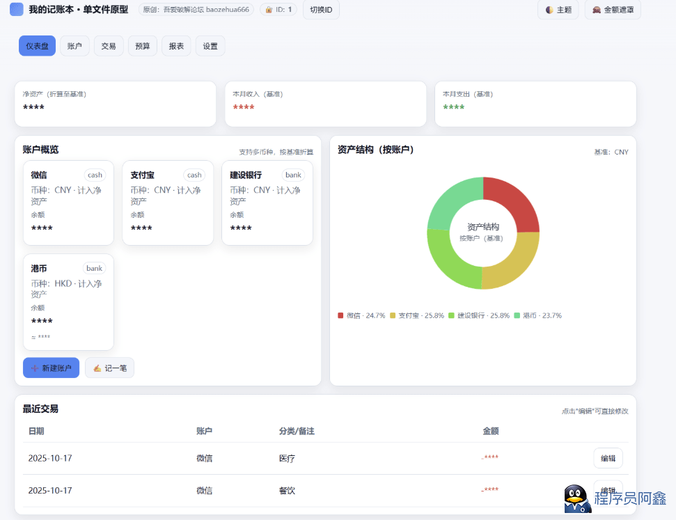 自己用ai辅助做的html记账工具。我的记账本v1.0这是一款功能强大的个人记账本应用,采用单文件HTML设计,无需安装,直接在浏览器中运行。支持多账户管理、多币种记账、预算管理、数据可视化等功能。