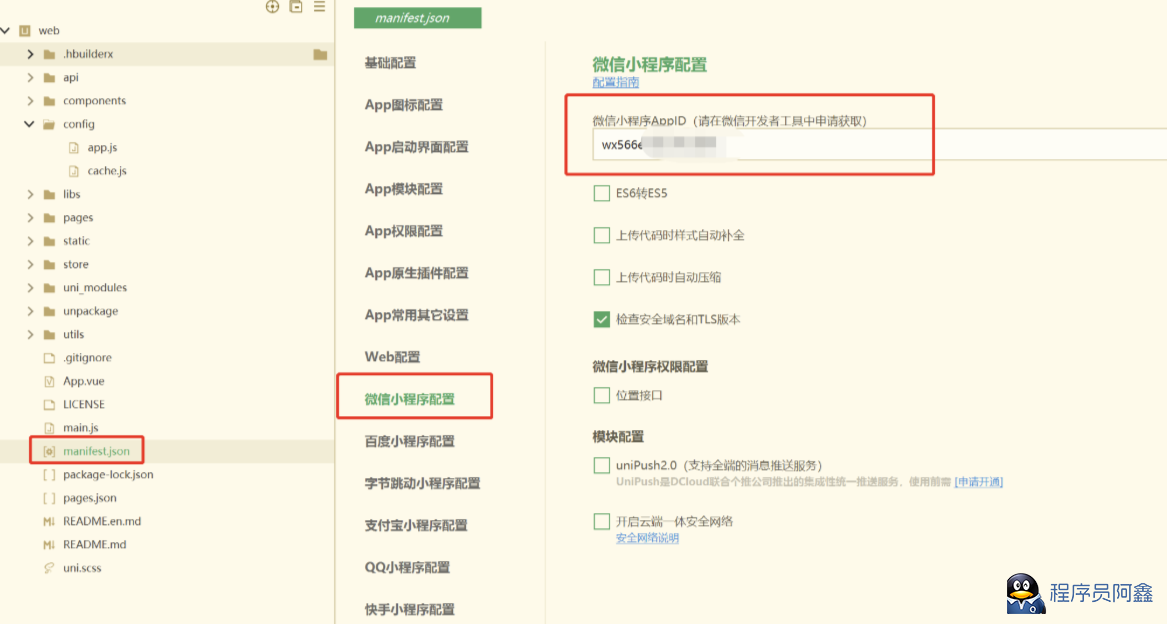 通过 HBuilder x打开源码的 web文件,打开 manifest.json 找到小程序配置