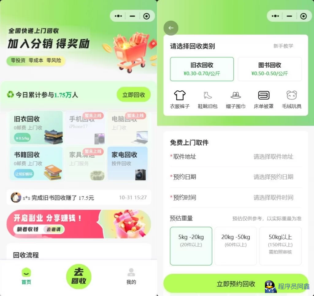 这是一款该旧物回收系统采用 GO 语言与 MySQL 5.7 技术栈构建,具备高稳定性与低维护成本。系统已集成第三方回收渠道对接功能,用户端小程序支持预约、定价等核心模块,无需二次开发即可快速部署。适合旧物回收创业或业务扩展场景,兼顾实用性与易用性。