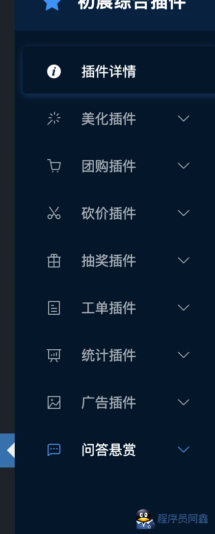 功能范围:美化插件、团购插件、砍价插件、抽奖插件、工单插件、统计插件、广告插件、悬赏插件