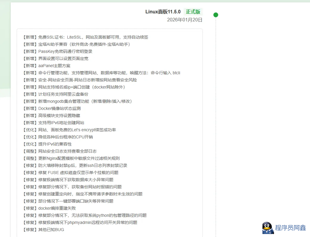 宝塔纯净版v11.5.0一键安装脚本(20260120版本)+宝塔9.6.0纪念版+linux测速脚本